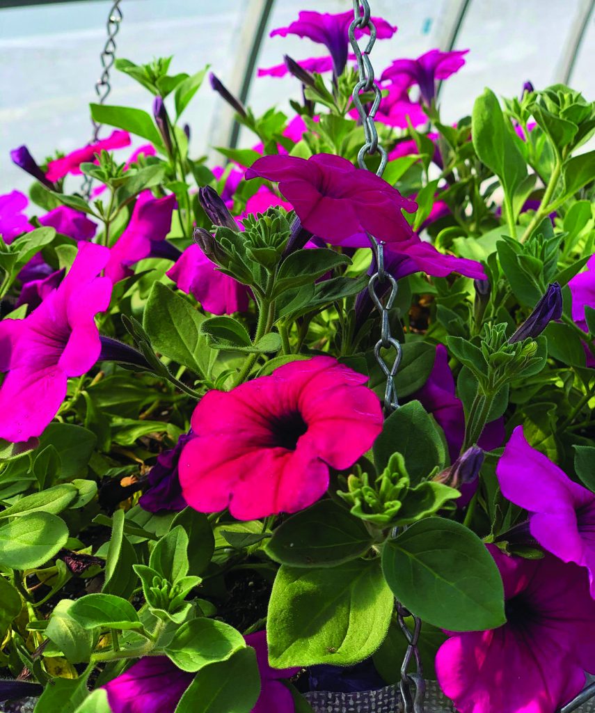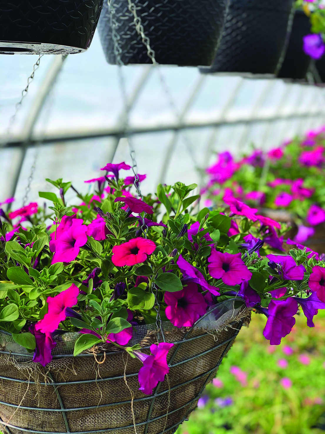 Brightly coloured hanging baskets are in full bloom at Lowey’s Greenhouse and Market, and ready to be placed along King’s Highway, by Project Petunia. The program relies on donations to keep it going. Baskets can be sponsored by businesses or individuals, and can even be to honour the memory of a loved one. – Submitted photo