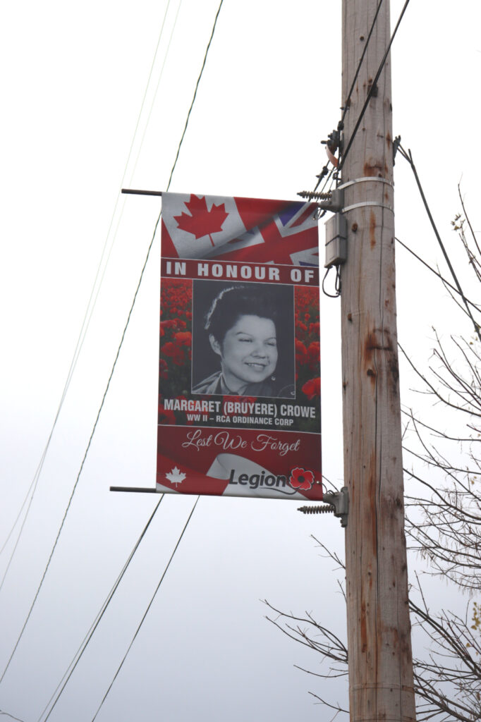 Among those recognized on banners throughout town are three woman who served on peacekeeping missions. The Crowe family had eight seven sons and a daughter who served. Margaret Crowe was an ordinance officer in the Second World War.