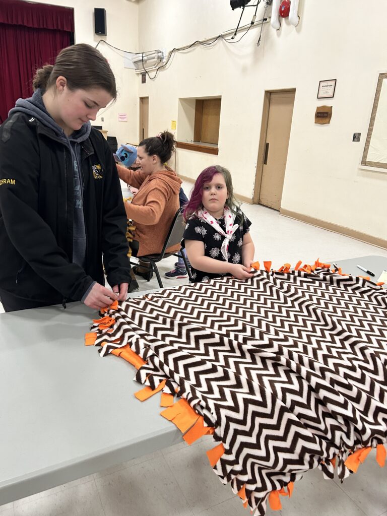 Last week, the Muskie Girls hockey team partnered up with the Girl Guide Sparks and Embers to create blankets for the bags. Using material which was donated by Betty’s of Fort Frances, and cut by the Muskie Cheerleaders, Muskie girls Avery and Danielle, alongside the Guides worked under the guidance of the Window and Door Store, to lend a hand.
