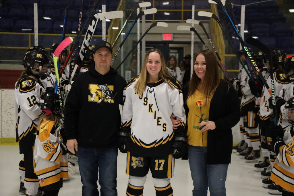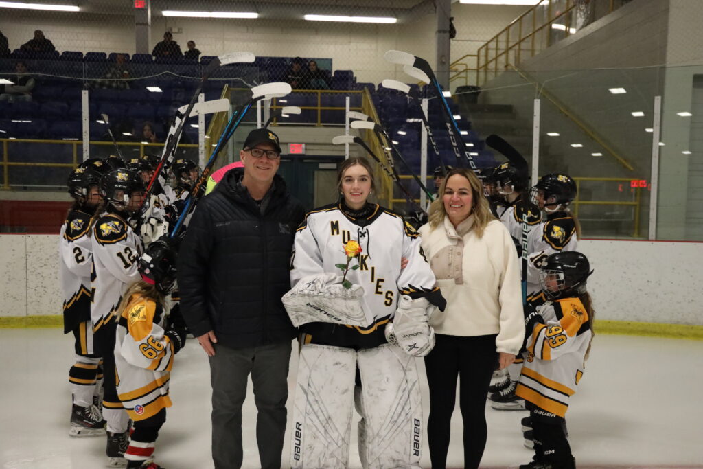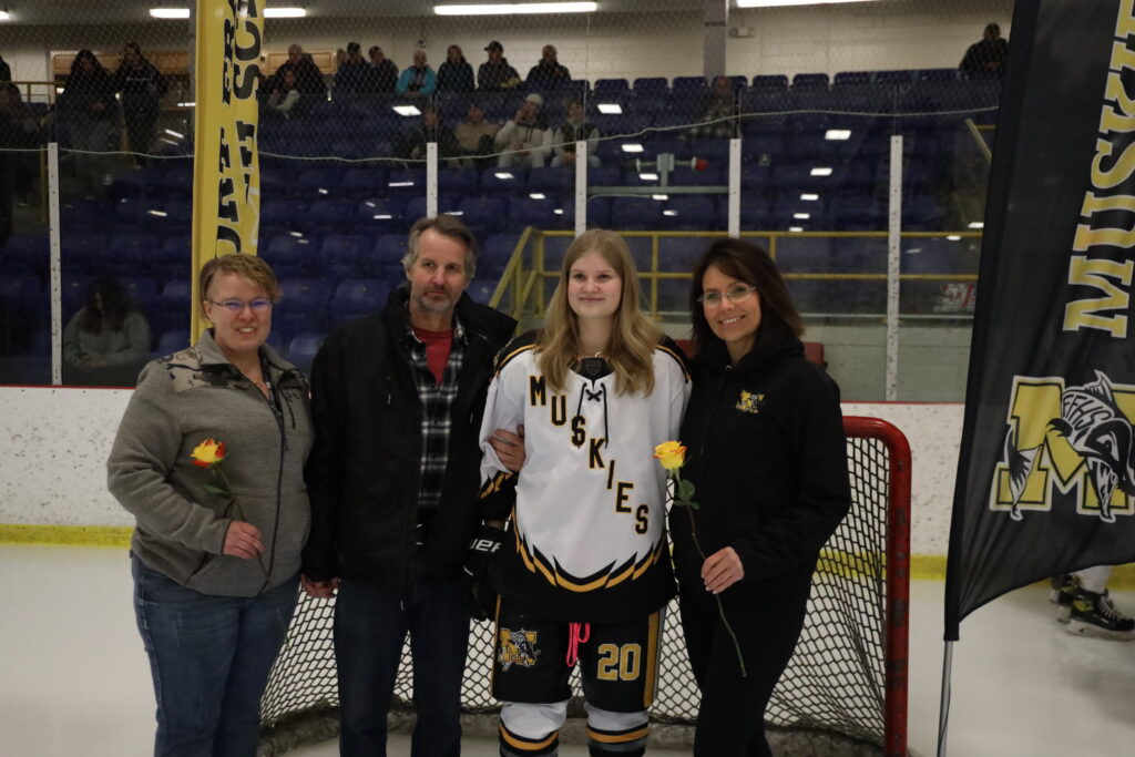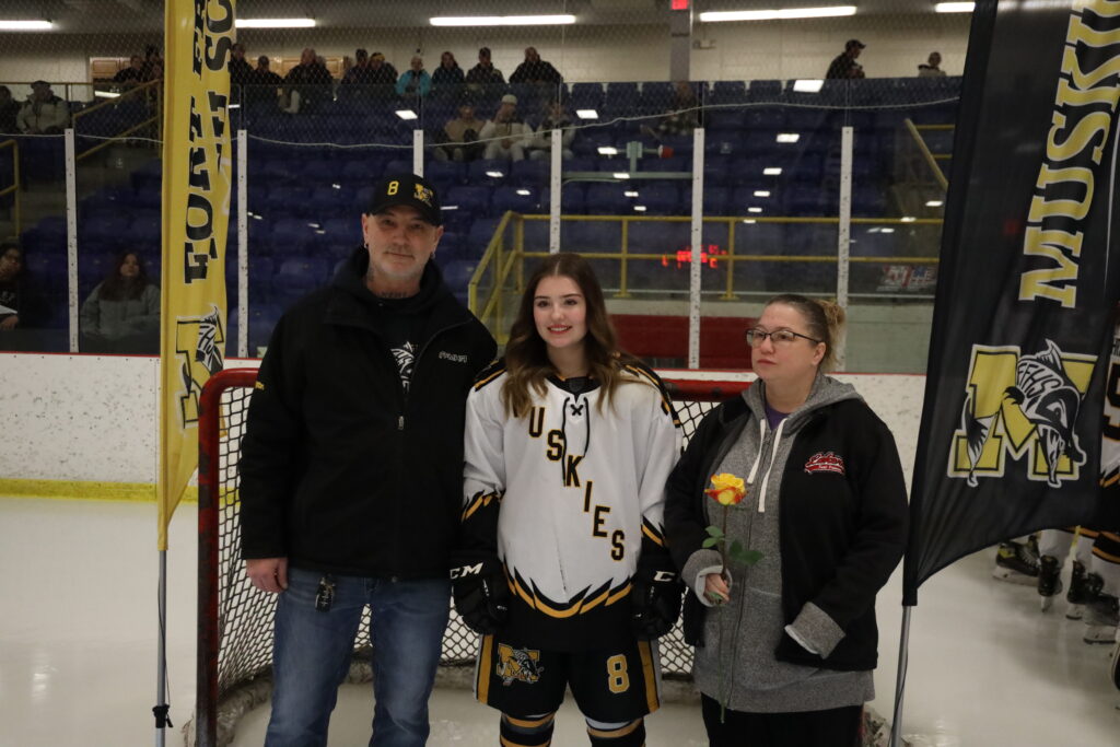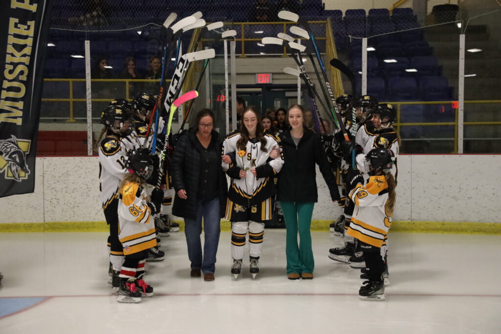 The Muskie Girls Seniors were honoured at a home game against the Dryden Eagles, on February 6. The team will be saying goodbye to six players at the end of the season: Hayden Allam, Isabelle Tanguay, Karsyn McQuaker, Kiera Fairnington, Kourtney McCoy, and Maddy Bliss. Each player was acknowledged, along with their parents and caregivers. The team went on to a 10-6 win over the Eagles