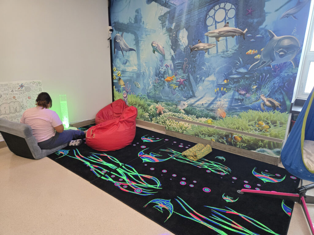 “We set it up where there’s a lot of space in the room, where they can do large movements, have compression, and do different things that kind of get the body moving,” said Tonello. “We also have a calming area that has a glow-in-the-dark carpet and it has a bubble tube that lights up and bubbles go up and down inside of it. We also have little lights that they can have in their hands and play with, and we have a light up table we can put either water, rice or sand, which also gives different sensory input for kids”