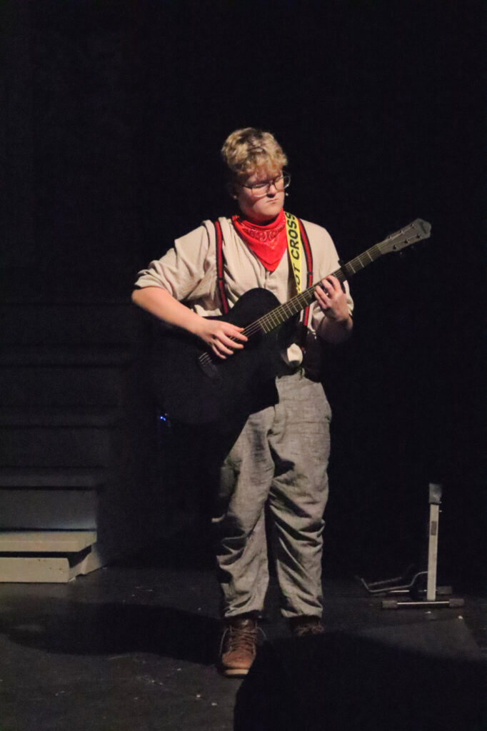 Above, even the Fates can’t blame Eurydice (Cassandra Armstrong, centre) for making her choice when the chips are down, and above right, Orpheus (Ethan Brown) creates the song that will bring Spring back to the world in Fort Frances High School’s production of Hadestown, a Tony award-winning New Orleans- and jazz-inspired musical retelling of the ancient Greek myth. Hadestown originated as a limited tour and concept album in the late 2000’s before becoming an off-Broadway show in 2016 and eventually winning eight Tony Awards at the 73rd Tony Awards in 2019. The show opens tonight with doors at 6:30 at the Townshend Theatre and will run again on Wednesday, Friday and Saturday nights, and tickets are available online at ticketscene.ca. For more information about the show, including an inside look from actors Cassandra Armstrong, Ethan Brown and Alex Bombay-Morrison, please see tomorrow’s edition of the Fort Frances Times.
