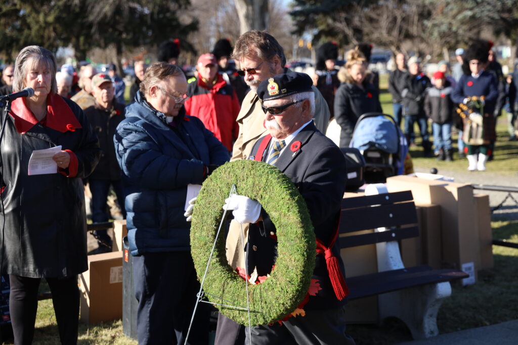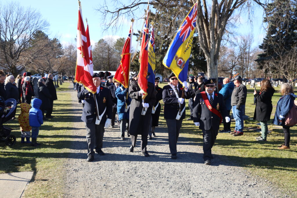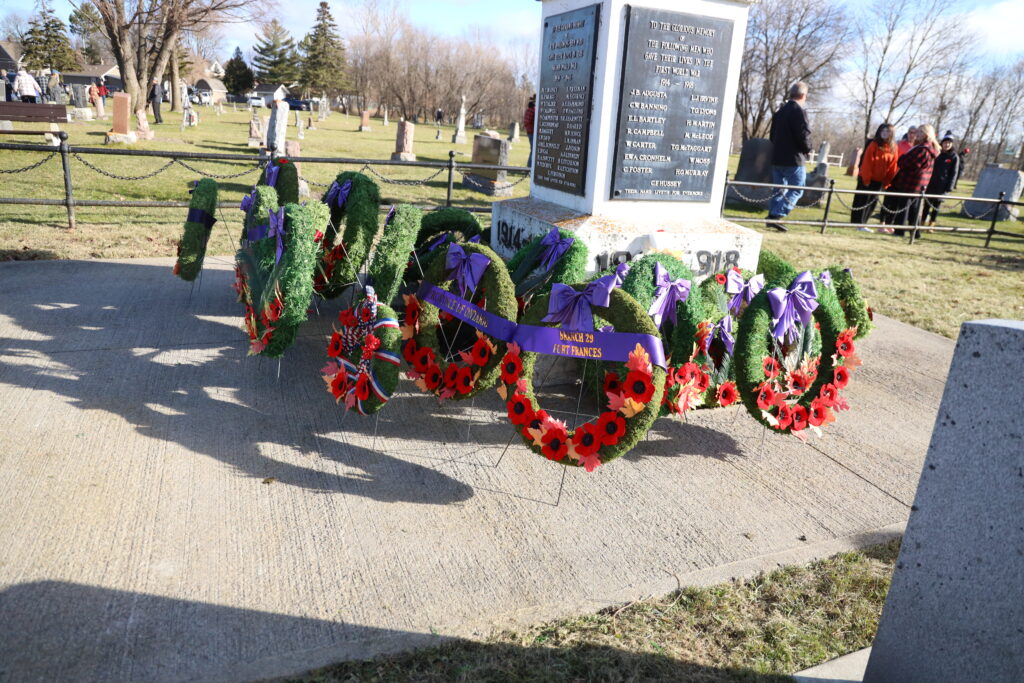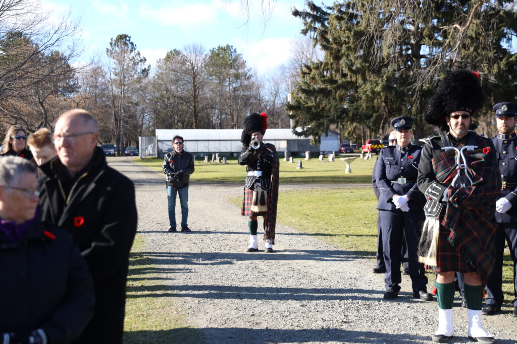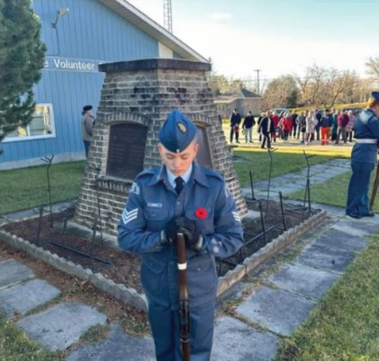 Remembrance Day observances took place across the District Monday, November 11, to honour the sacrifices of Canadian soldiers. In Fort Frances, the colour party arrived at the cenotaph in the Fort Frances Cemetery, led by Rod Cupp, on flag duty. Right, Travis Enge performed the Last Post. Centre right, Deputy Mayor Mike Behan represented the municipality in the laying of the Town’s wreath. Bottom right, The Rainy Lake Highlanders led the procession at the end of the ceremony. Below, the Cenotaph was adorned with nearly three dozen wreaths, to pay respect to Canada’s fallen soldiers. – Allan Bradbury photosScreenshotHundreds gathered in cemeteries and cenotaphs throughout the district to take part in Remembrance Day ceremonies November 11. Above, a cadet from the 908 Rainy Lake Royal Canadian Air Cadets serves sentry duty throughout the ceremony at the Devlin/LaVallee cenotaph. Right, the Emo ceremonies were led by the Emo Legion Branch #99 Colour Party. Robin McCormick and staff photos