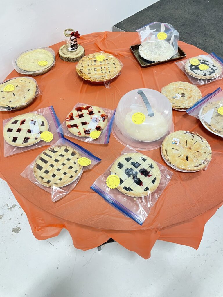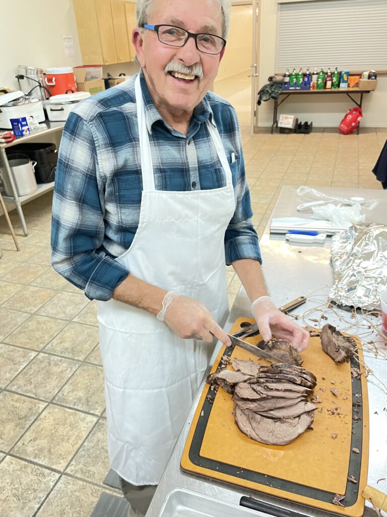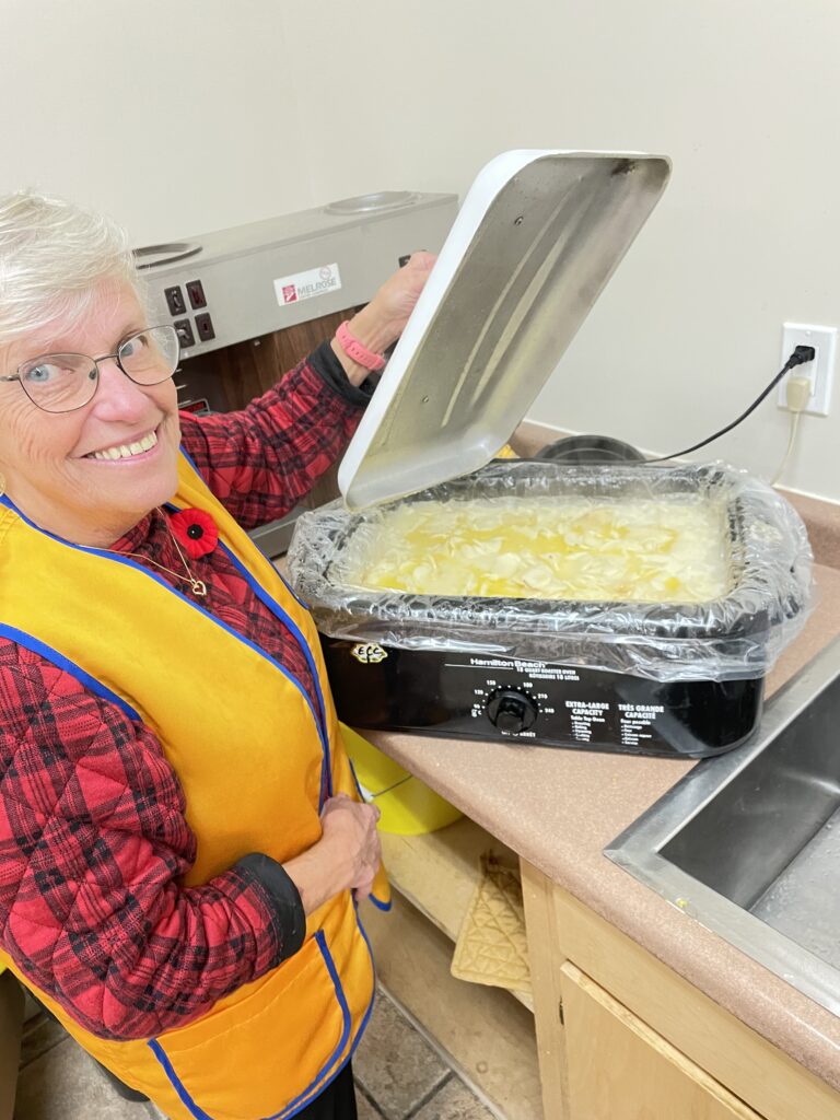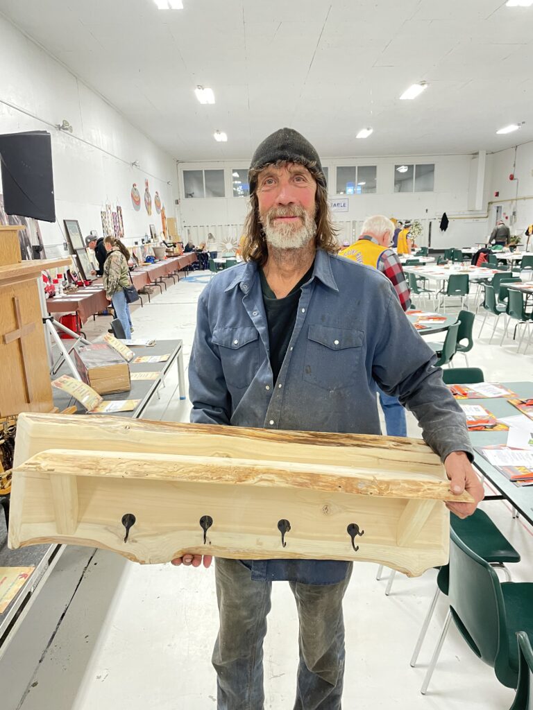 Clockwise from left: a rack, great for hanging up those winter jackets Crafted by Alex Anderson, was one of the hundreds of items up for auction; scalloped potatoes – simply delicious and made by Jeanette Amstrong; Lion Dave Ivall, master Moose Roast Carver; A small part of the Lions volunteer army, L_R Lou Ricci, Peggy Advent, Kristy Tesarsky and Terri Anne Lundgren. The pie Auction! MMM,MMM, Mine was delicious!