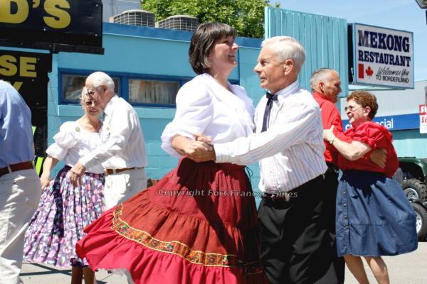 Gloria Sheloff, Len LaRocque, Sandy Wepruk, Jim Sheloff, Bert Smeeth, Eva Angus, and Marj Smeeth went for a spin along with other members of the Fort Frances Pairs ’n Squares club during “Mall Days” on Friday afternoon at the southwest corner of Scott and Portage.